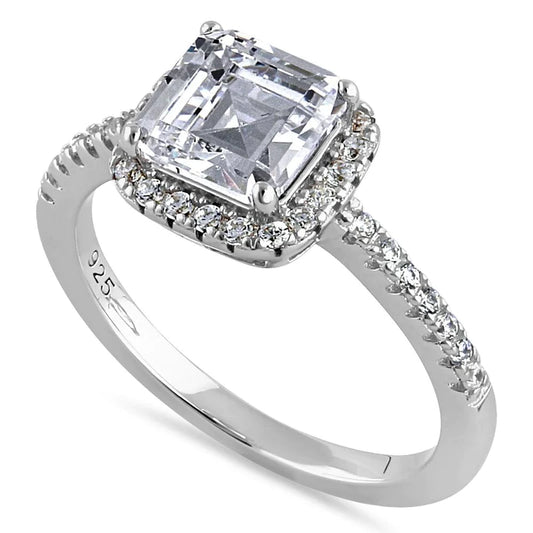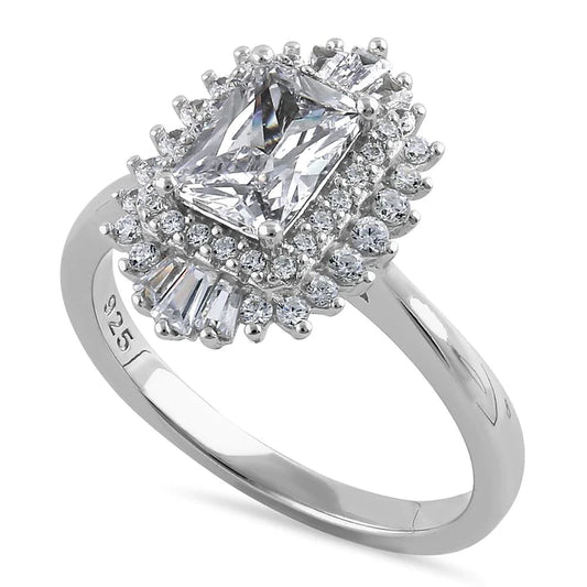 Sterling Silver Chic Emerald Cut Halo Clear CZ Engagement Ring
