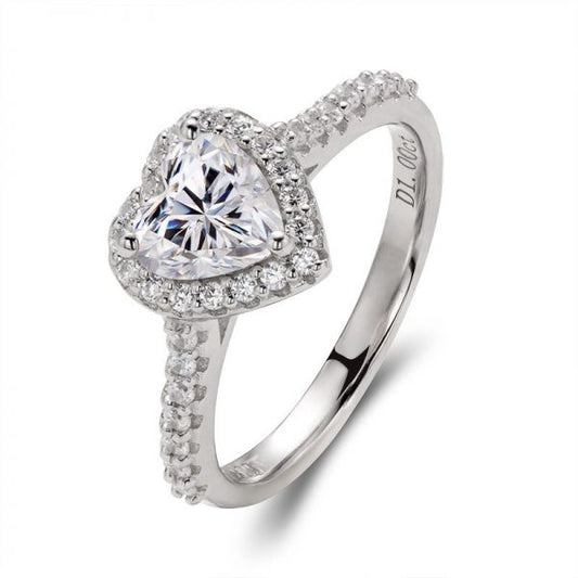 Sterling Silver 1 Carat Heart Cut Halo and Side Stones Moissanite Ring