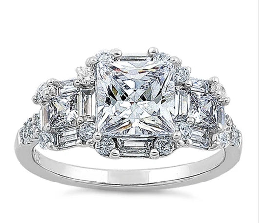 Sterling Silver Classic Princess, Emerald & Round Cut Clear CZ Ring