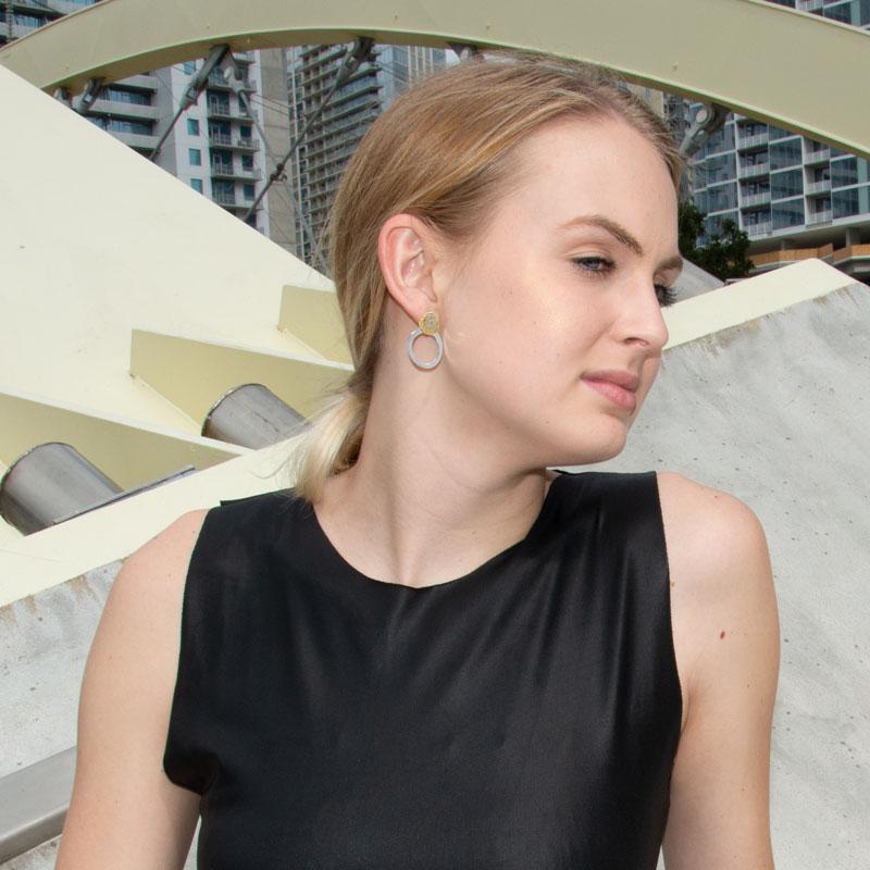 A touch of glam with these rhodium and 14 karat gold plated sterling silver post earrings. Post sparkles with 1mm pave CZ setting and measures 12mm x 10.2mm. Circle drop is 21.5mm with textured finish and dangles from a loop on back. Hanging length is 27.5mm. .925 Sterling Silver