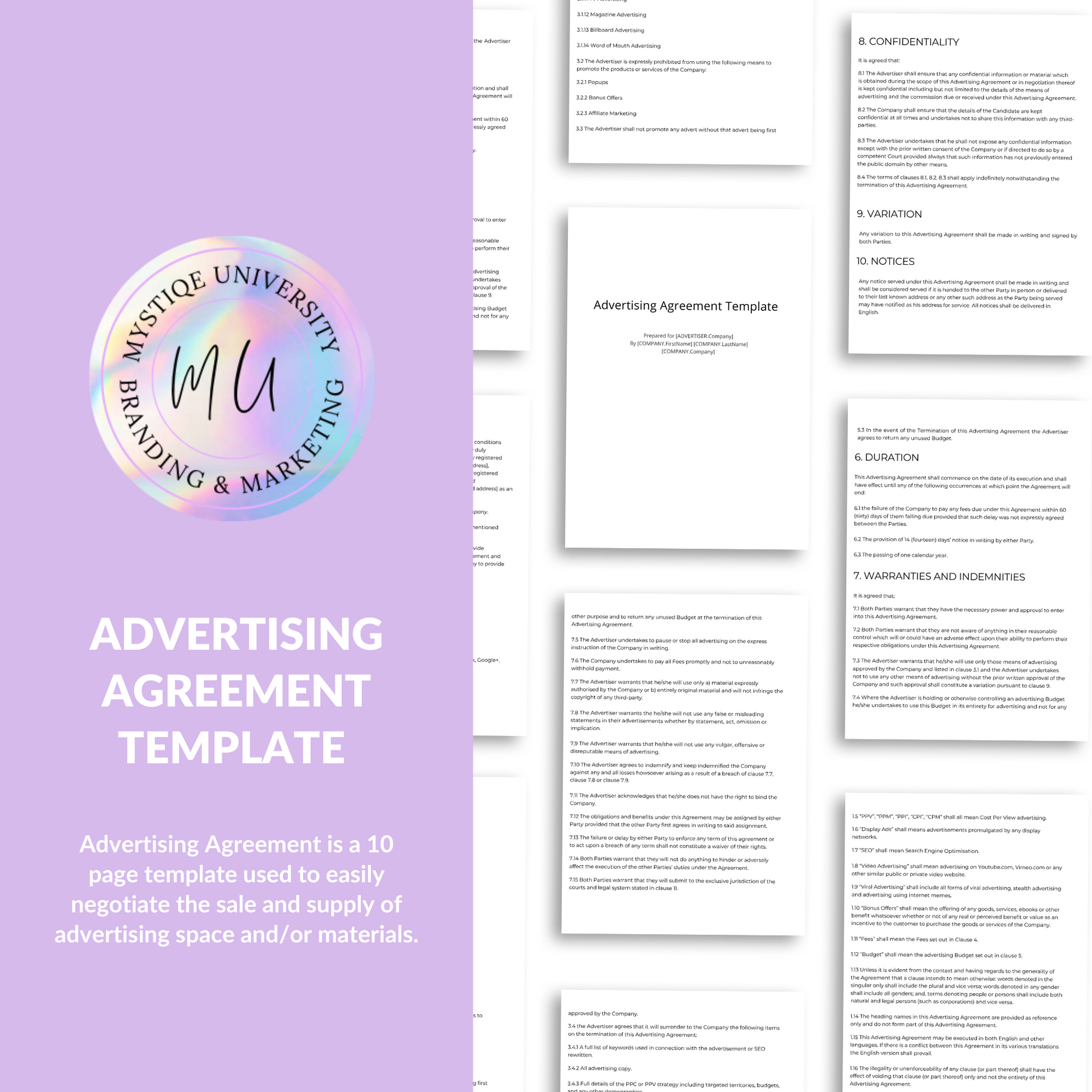 Advertising Agreement is a 10 page template to easily negotiate the sale and supply of advertising space and/or materials.