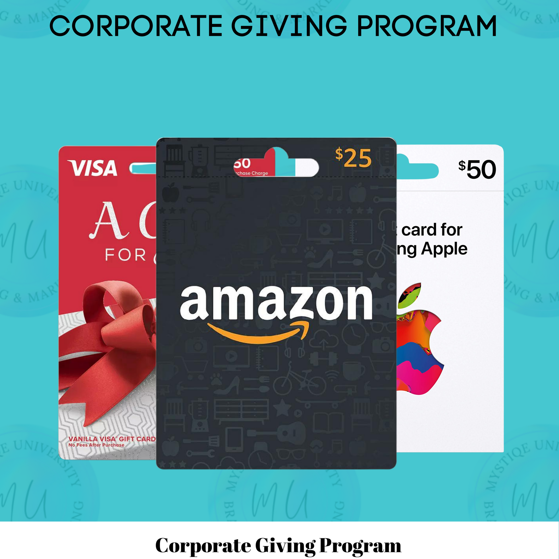 Seeking a way to recognize and reward your workforce? Our Corporate Giving Program is the perfect solution, providing your company with physical and digital gift cards and Paypal/Bank transfers for Holiday gifts. With our platform, you have access to over 300 companies offering slightly discounted gift cards.