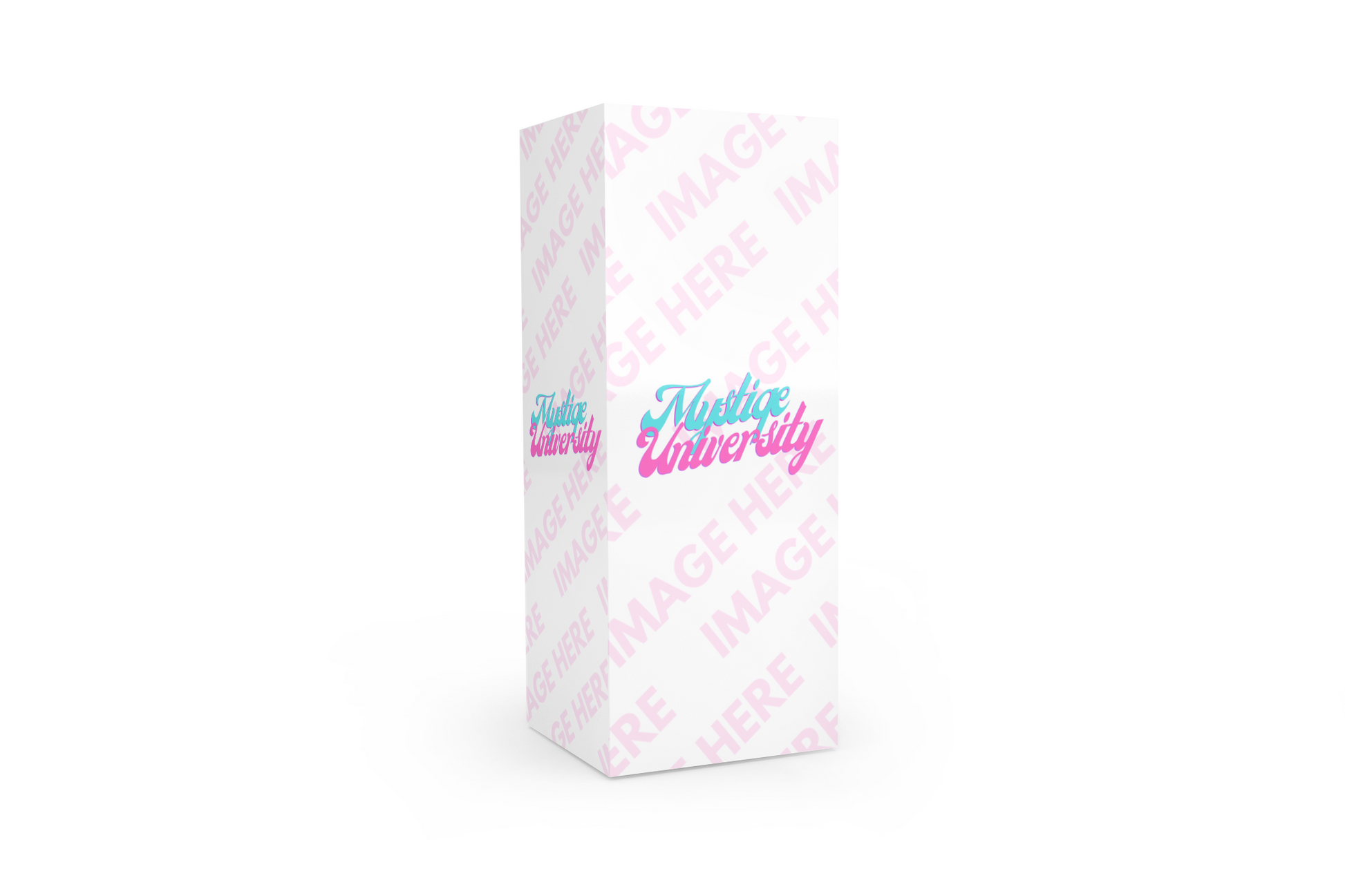 This mockup template is perfect for showcasing a tall product box. A shiny cardboard vertical box standing isolated on a white background. Create your product mockup for medicals, cosmetics or any product that is packaged in a similar box.