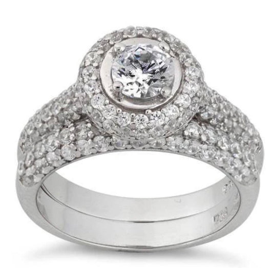 Sterling Silver Halo Round CZ Engagement Set Ring