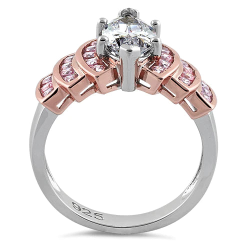 Sterling Silver Two Tone Rose Gold Marquise Engagement Clear & Pink CZ Ring