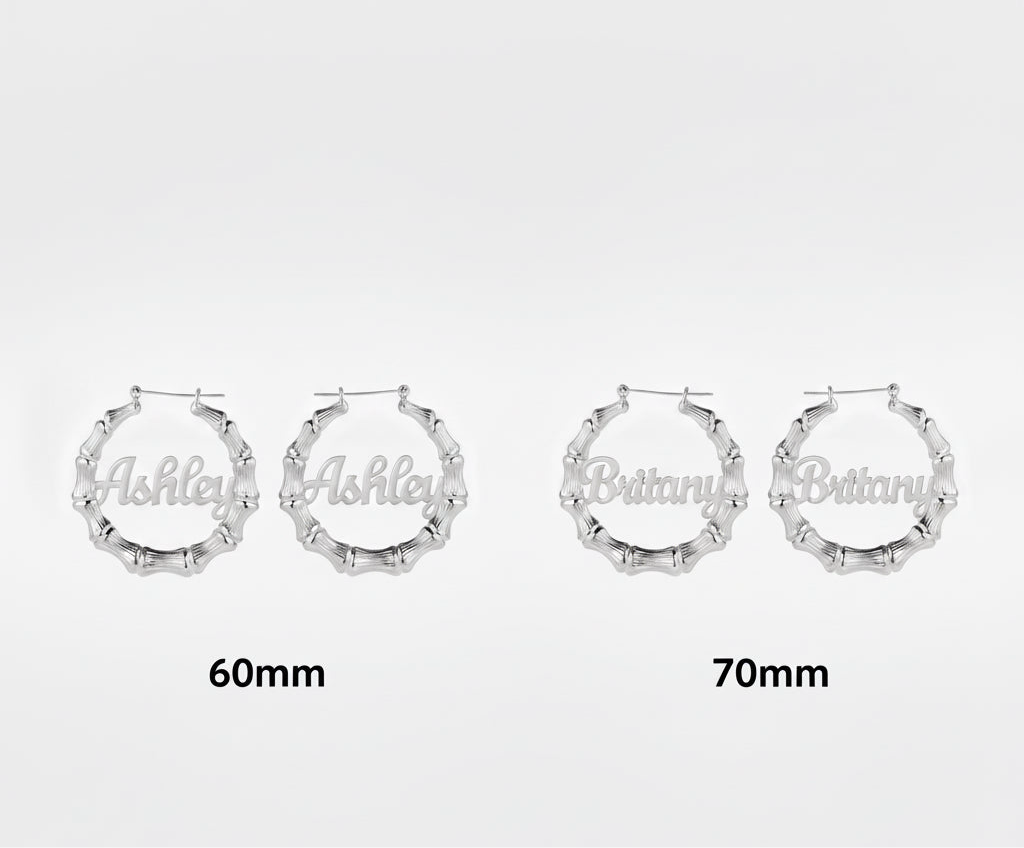Elevate your style with our stunning and fully customizable Sterling Silver Bamboo Name Earrings. These iconic hoops blend classic bamboo styling with a modern personalized touch, making them the perfect accessory to express your unique identity or celebrate a loved one.
