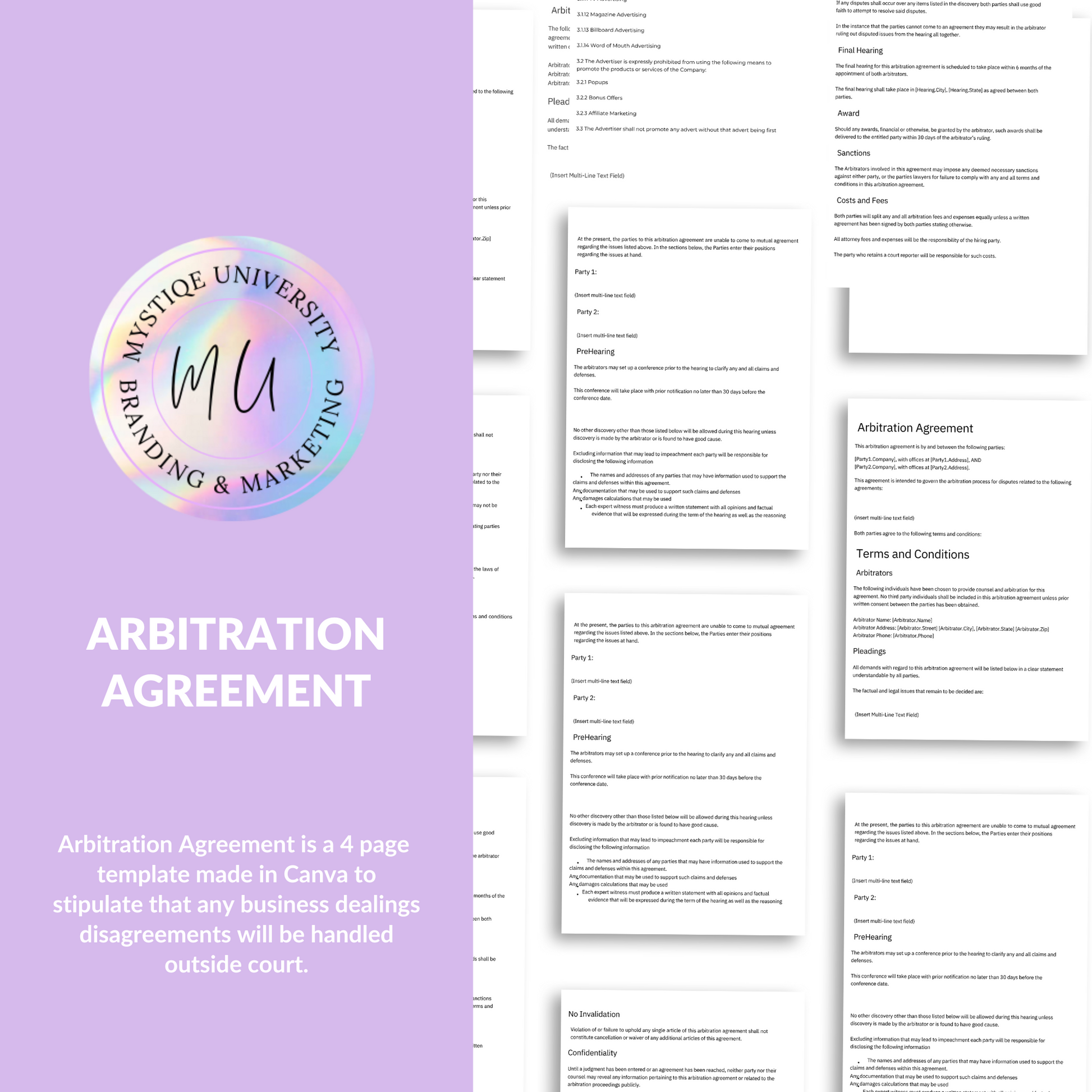 4 page Arbitration Agreement made in Canva and Microsoft Word used to stipulate that any business dealings disagreements will be handled outside court.