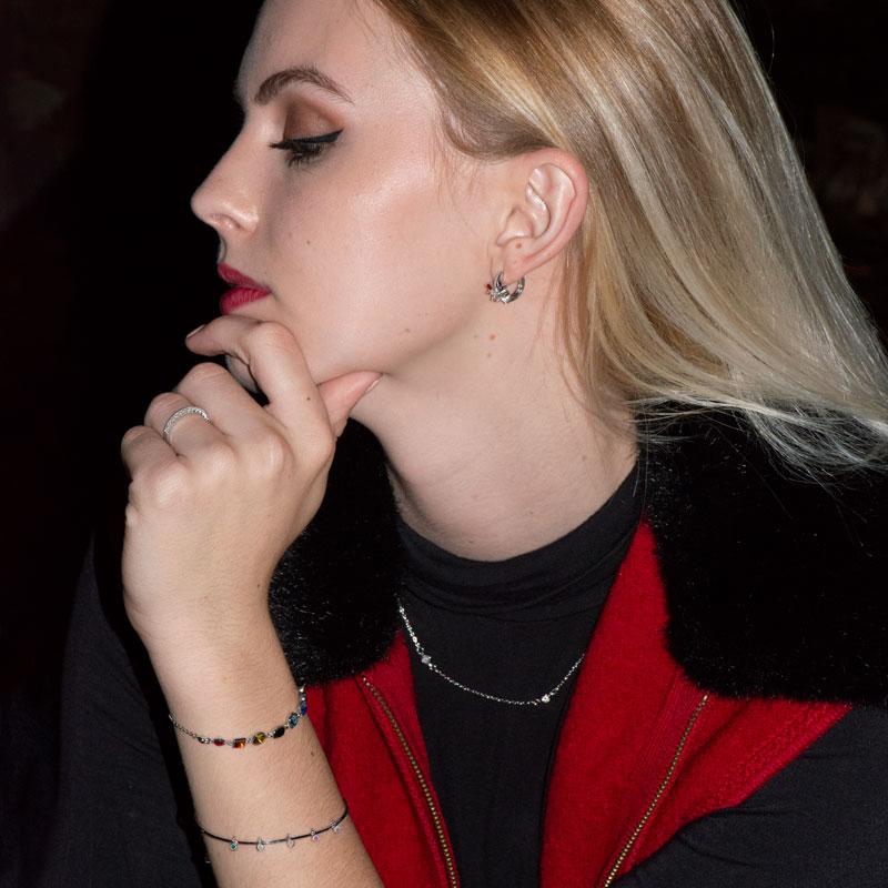 Rhodium plated sterling silver 1.5mm tubing flex cuff with five 2.8mm bezel set drops holding 2mm rainbow color CZ's. The bead ends of cuff measure 3.1mm. .925 Sterling Silver