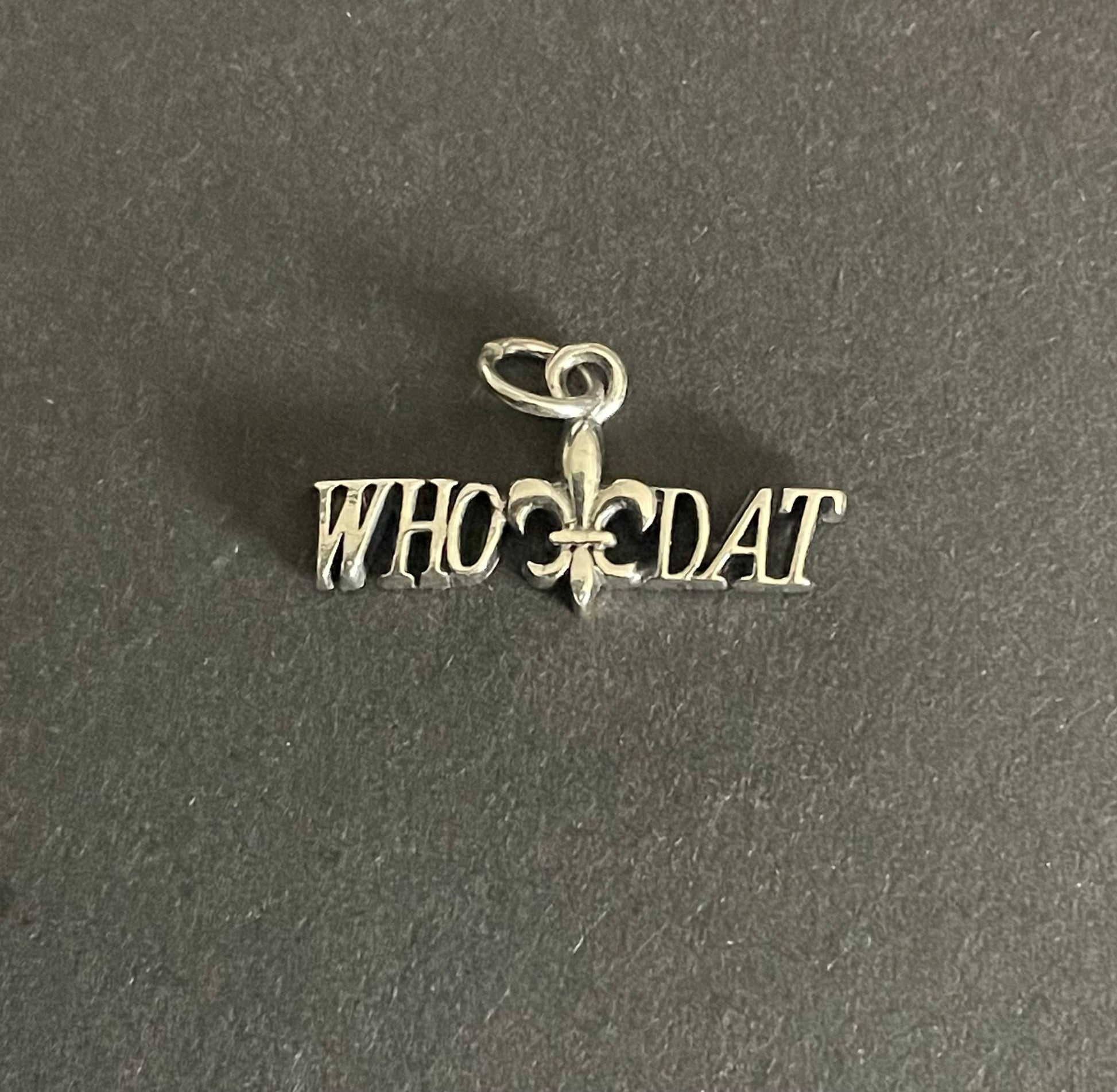 Gleaming sterling silver Who Dat Pendant adorned with a Fleur De Lis, measuring approximately 22mm long and 4mm high.