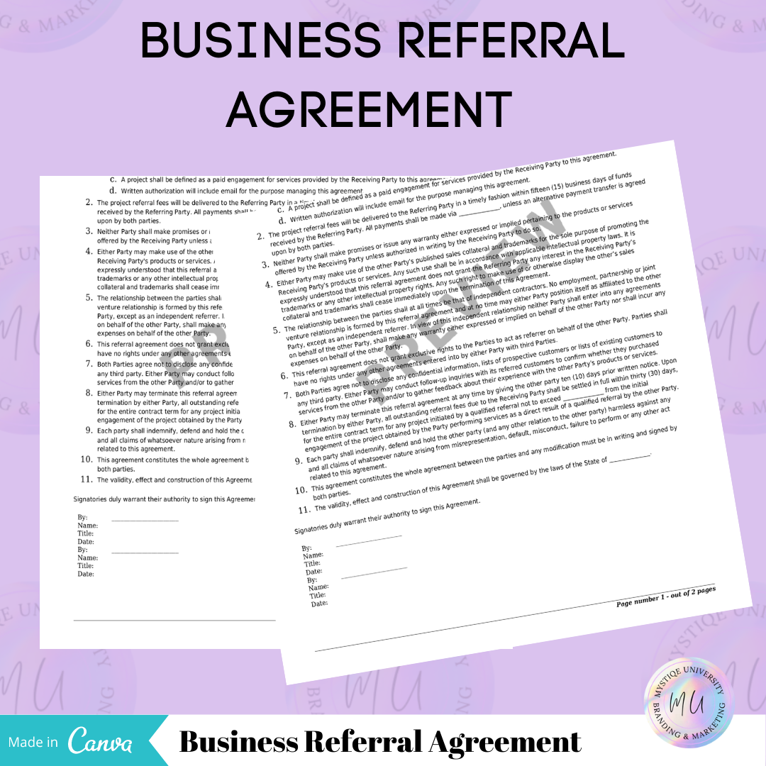 Este acuerdo es excelente para alguien que genera muchos negocios o clientes para otros. Utilice un acuerdo de recomendación comercial para recibir un pago por recomendar clientes potenciales o para compensar a otra persona por enviarle un cliente.