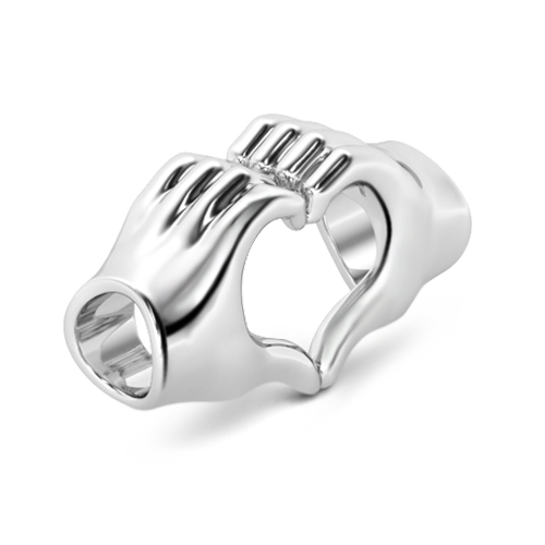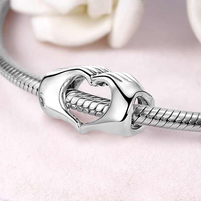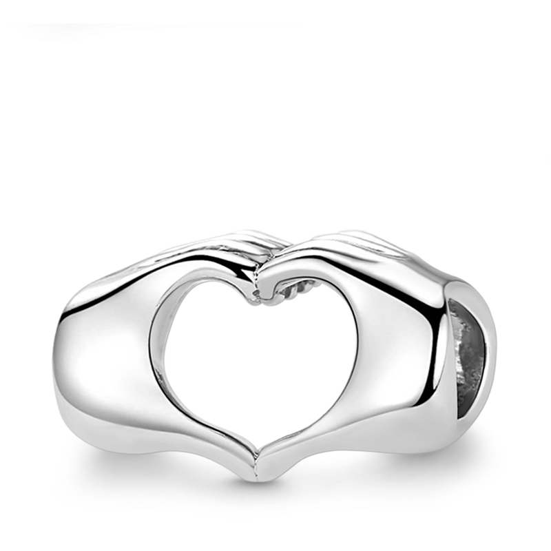 Este dije de pulsera presenta un par de manos que se juntan y forman la forma de un corazón. Con un acabado plateado brillante, este dije transmite un mensaje de amor y es un regalo perfecto para su pareja.