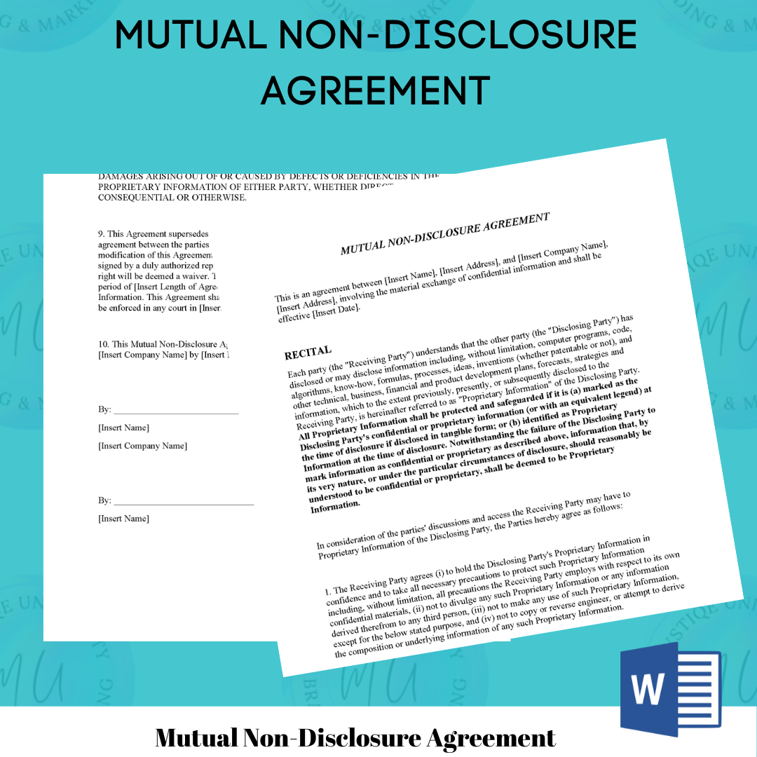 Plantilla de acuerdo mutuo de confidencialidad de 3 páginas como documento de Word para crear un contrato vinculante y cubrir cualquier contingencia.