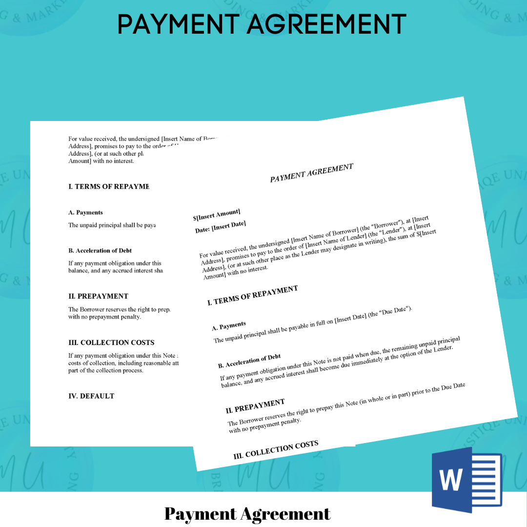 Plantilla de acuerdo de pago de 3 páginas como documento de Word para especificar términos como la frecuencia de las cuotas, la fecha de vencimiento y más