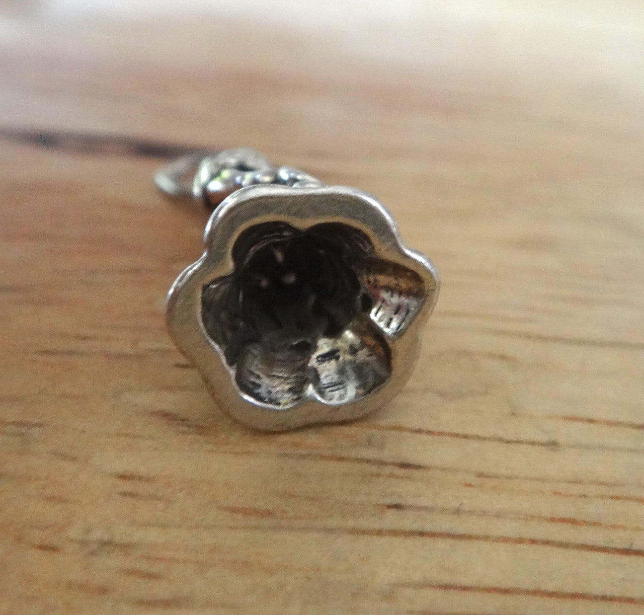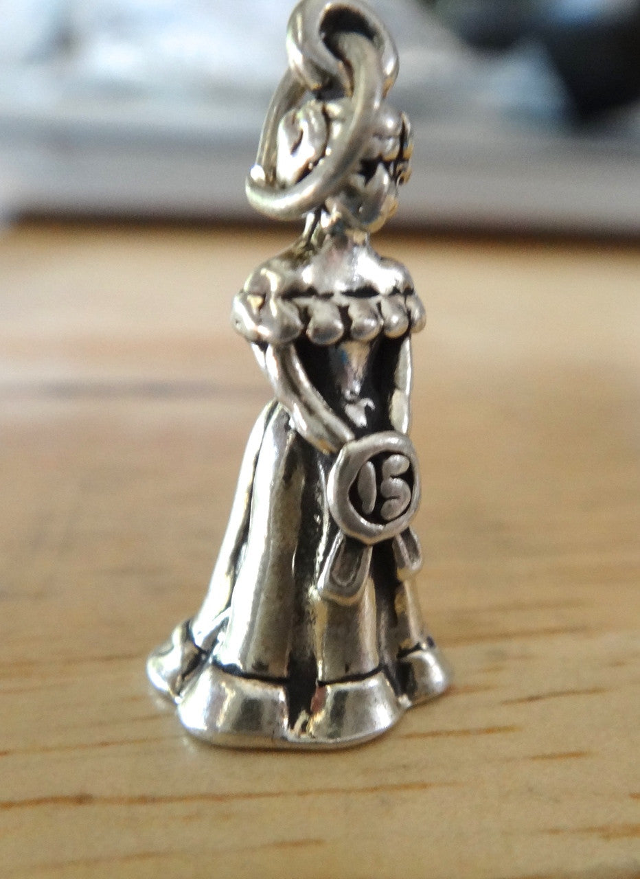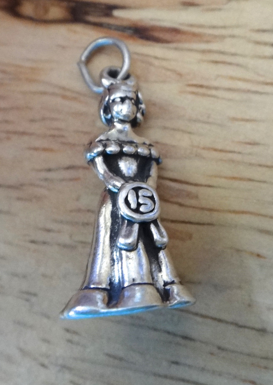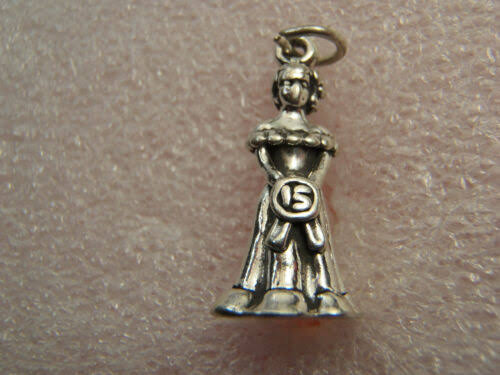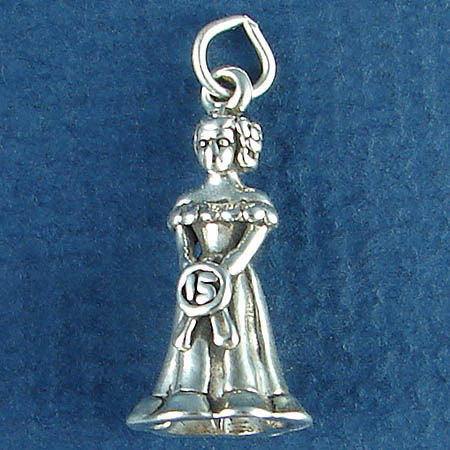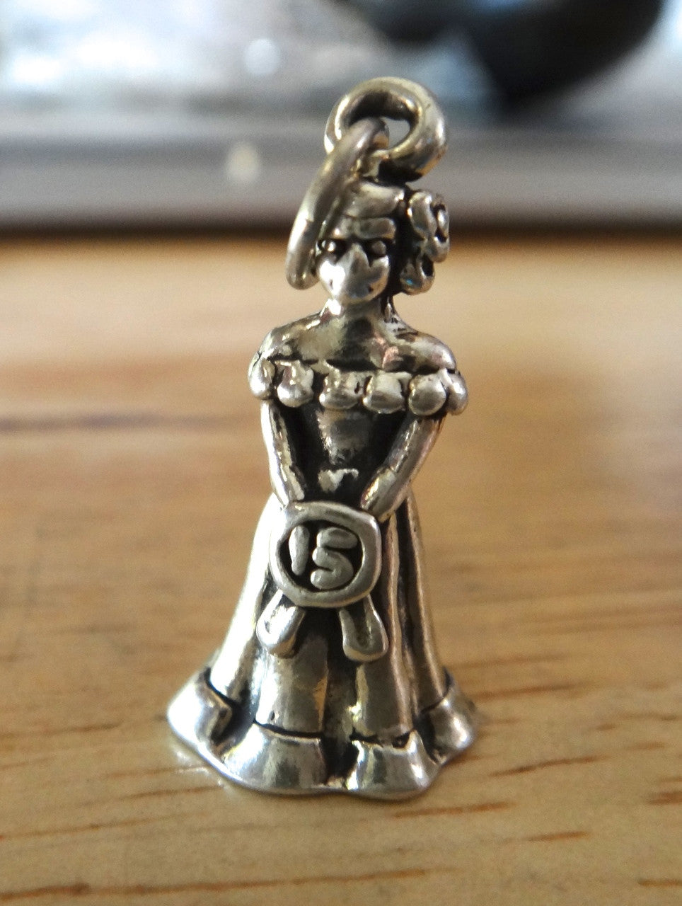¡El encanto es tan bonito! La niña está vestida de manera formal y sostiene un ramo que dice 15. El dije mide 23 mm de alto y 11 mm de ancho.
