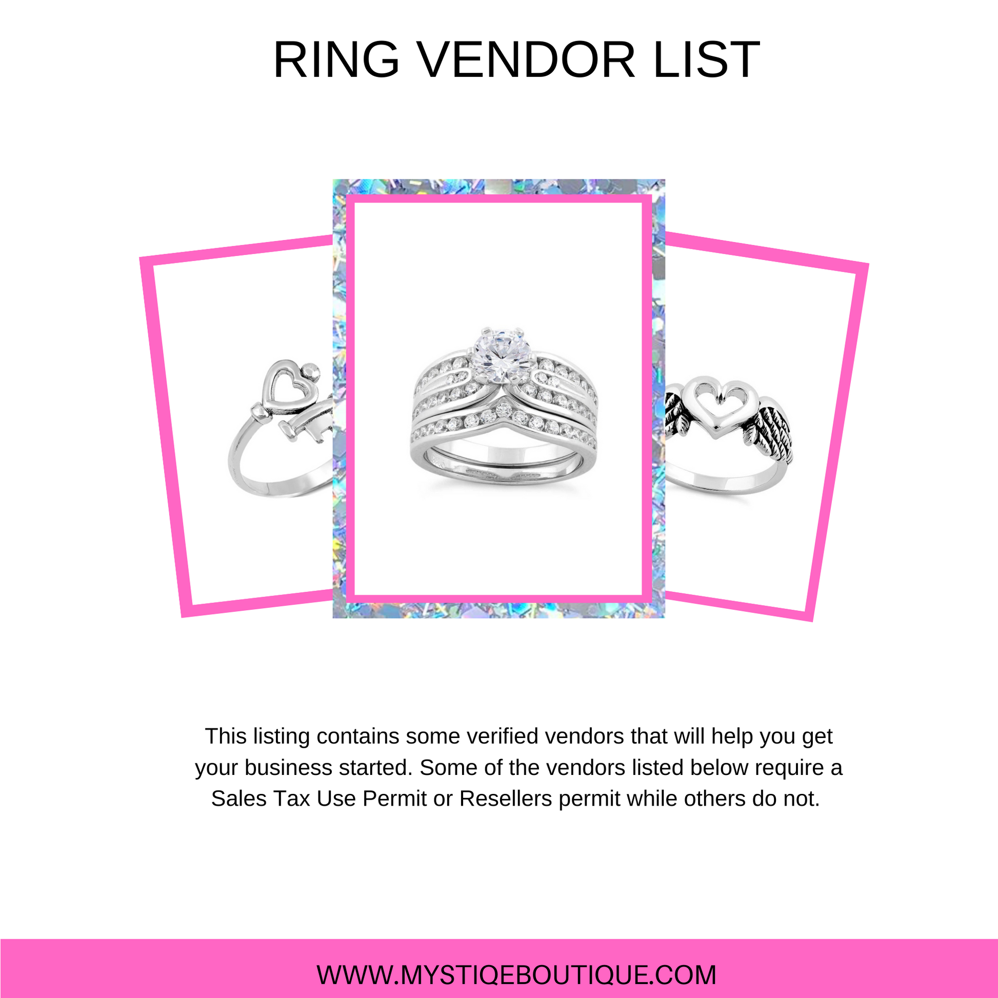 Este listado contiene algunos proveedores verificados que lo ayudarán a iniciar su negocio. Algunos de los proveedores que se enumeran a continuación requieren un permiso de uso del impuesto sobre las ventas o un permiso de revendedor, mientras que otros no. Todos los encantos son de plata de ley. Algunas de las empresas no ofrecen anillos al por mayor, pero se pueden comprar a precios razonables. Hemos utilizado personalmente a los proveedores para todos nuestros anillos.
