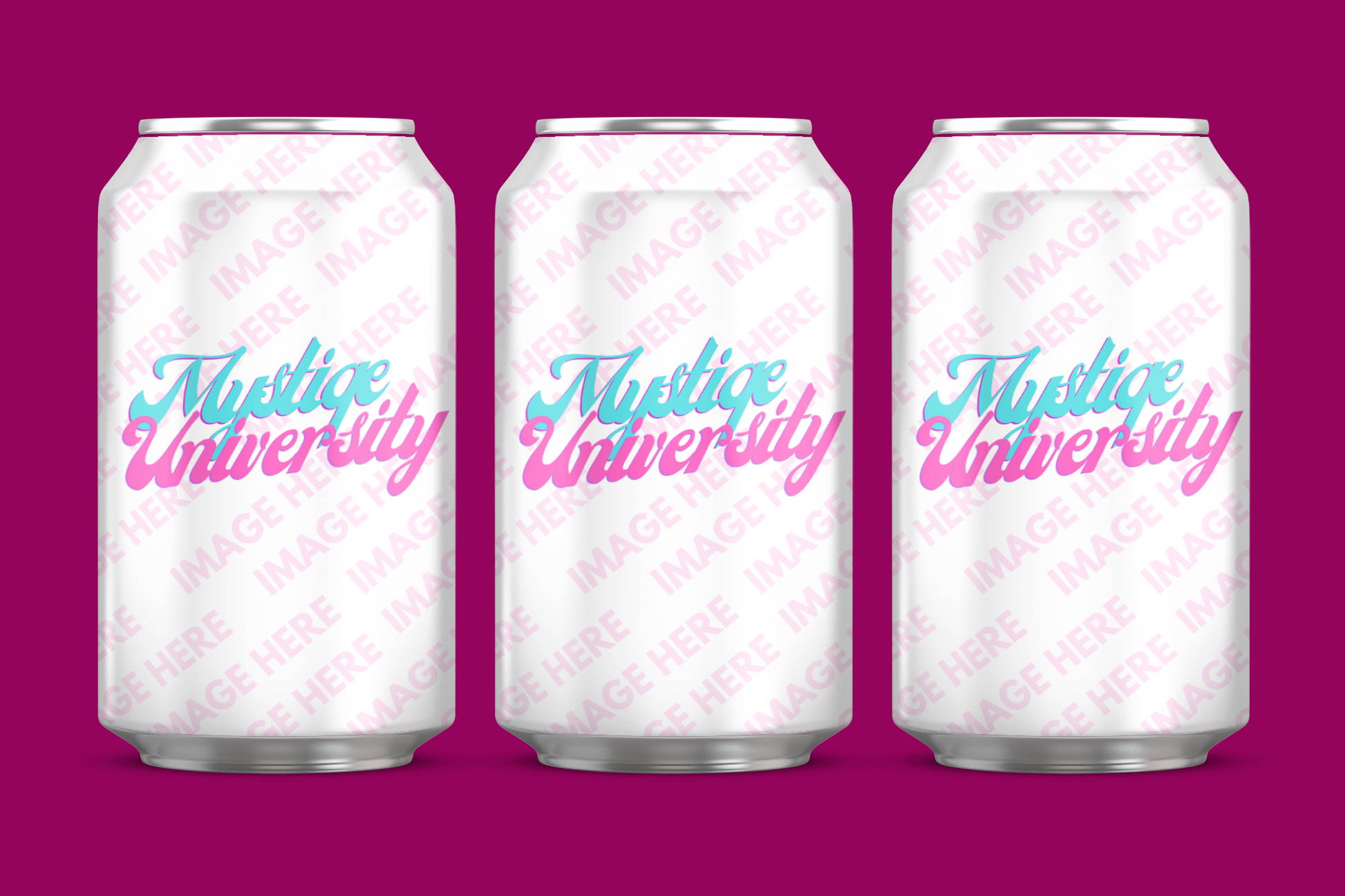 Maqueta de lata de refresco triple que presenta una vista frontal de 3 latas una al lado de la otra. Sube tu propio diseño de etiqueta y crea una maqueta de lata de bebida instantánea.