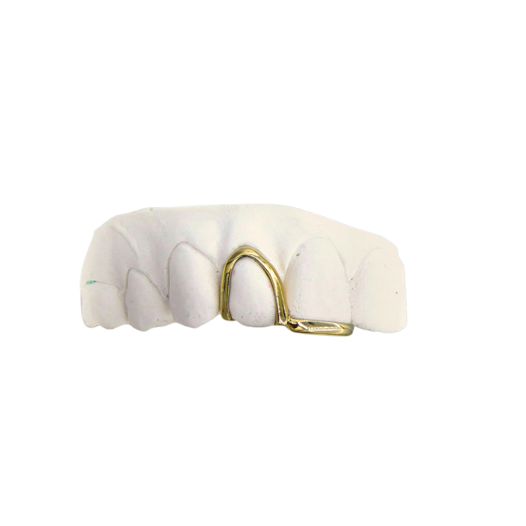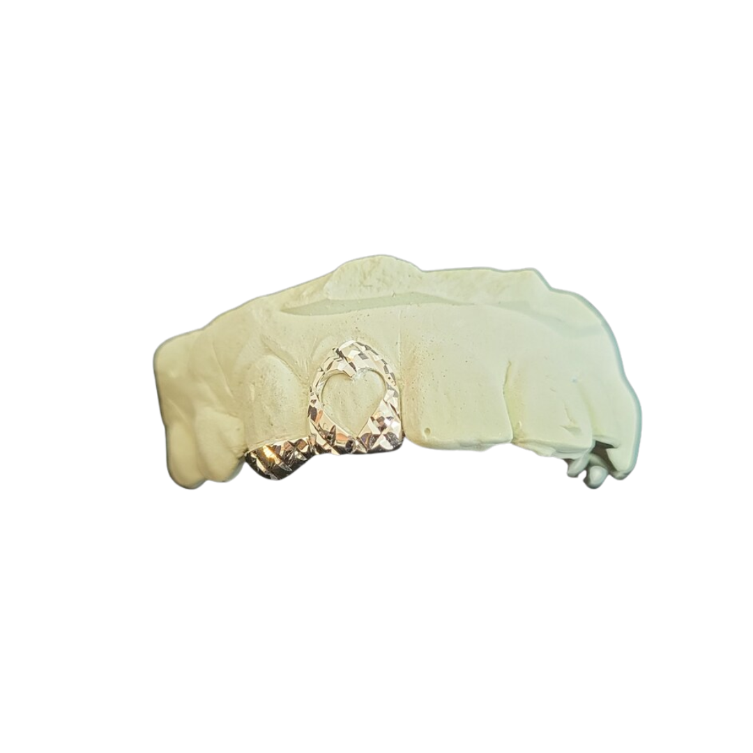 This item includes a two-piece grillz set made from 10K gold, available in White Gold, Yellow Gold, or Rose Gold finishes. Buyers can choose from multiple designs such as Open Face, Diamond Cuts, and Diamond Dust to suit their style preferences.