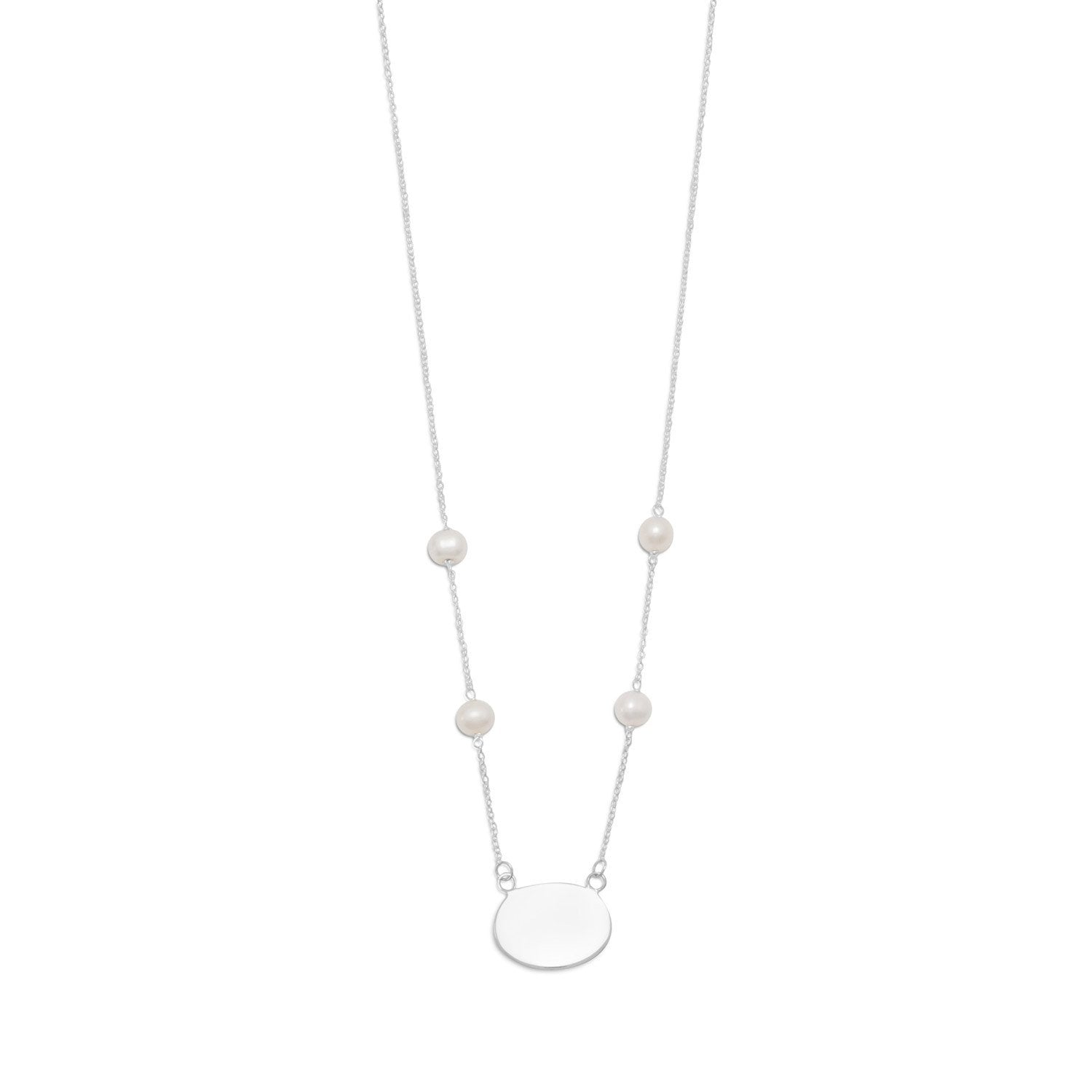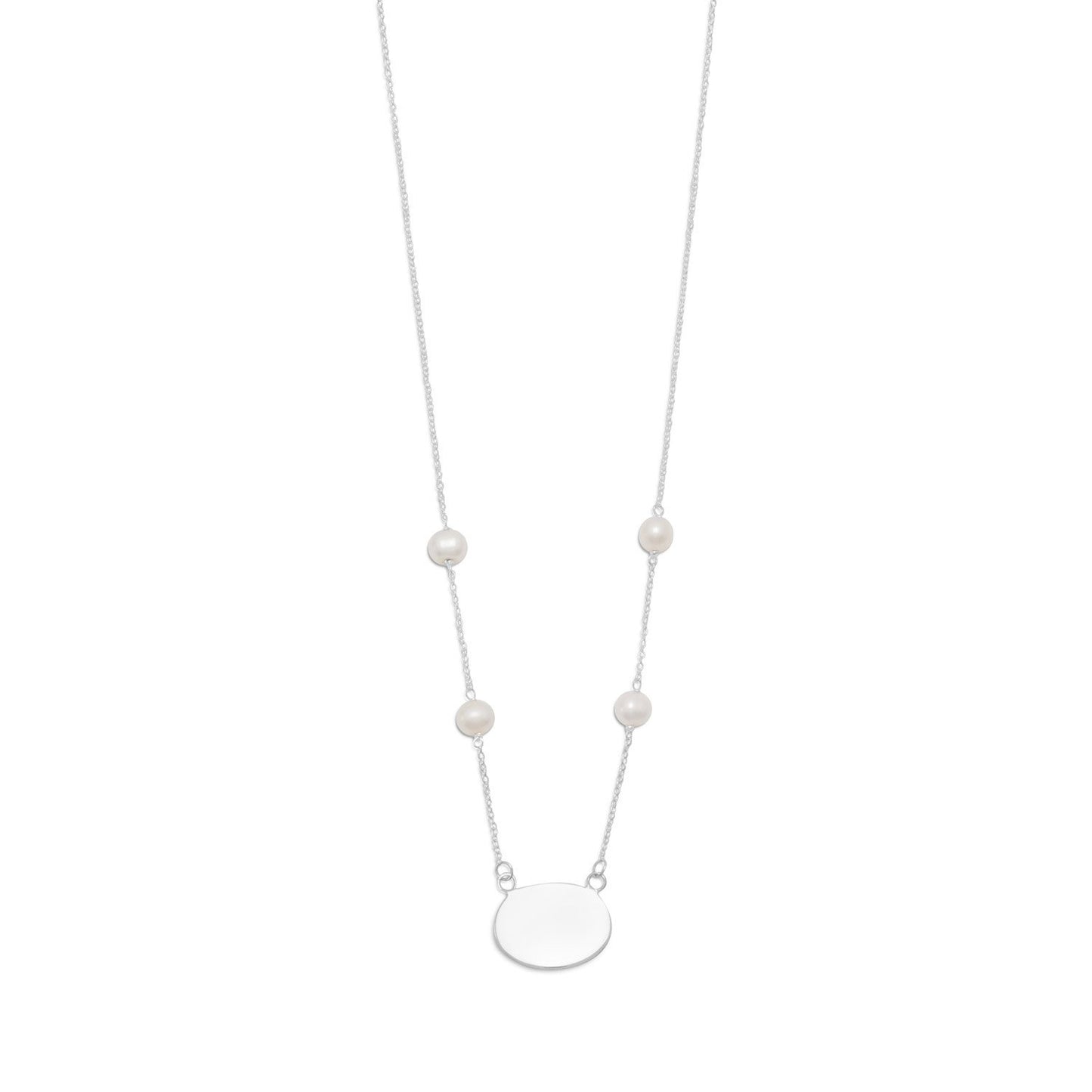 16" sterling silver necklace with 6.5mm cultured freshwater pearls and 19.5mm x 14mm oval engravable tag. .925 Sterling Silver Note: Please allow up to five (5) business days for your personalized item to ship. If you prefer your non-engraved items be shipped immediately, please indicate that in the Order Notes at checkout; otherwise, your entire order will be held and shipped complete when engraving items are ready.