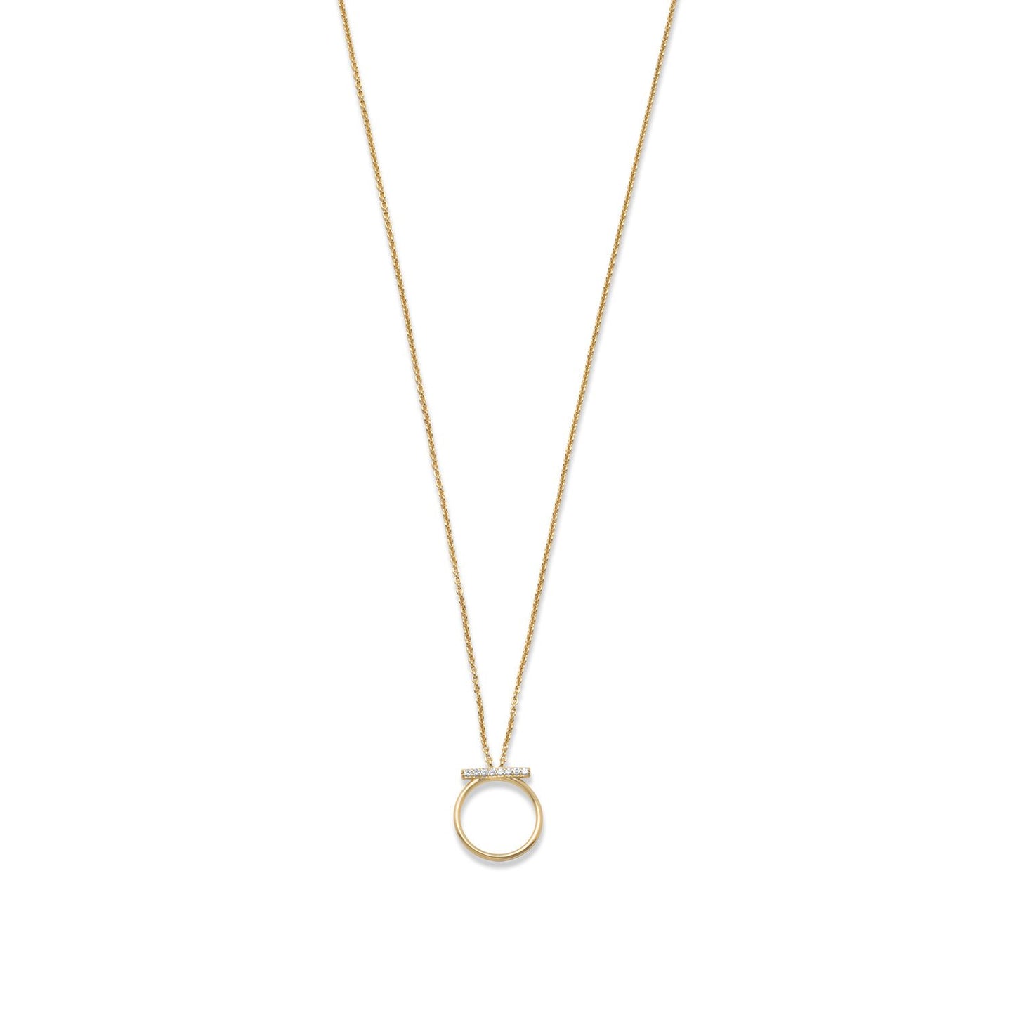16" + 2" extension 18 karat gold plated sterling silver cable chain necklace featuring a 15.2mm open circle pendant with a 0.5" long horizontal bar on top. The horizontal bar has 8 individual prong set 1.3mm CZs. This necklace has a lobster clasp closure. .925 Sterling Silver