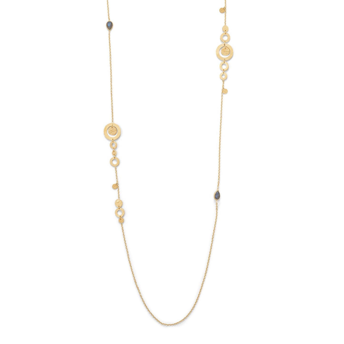 We love this whimsical necklace! 36" 14 karat gold plated sterling silver with two labradorite stones with hammered and brushed disks. Labradorite measures approximately 7mm x 5mm. This necklace has a lobster clasp closure. .925 Sterling Silver