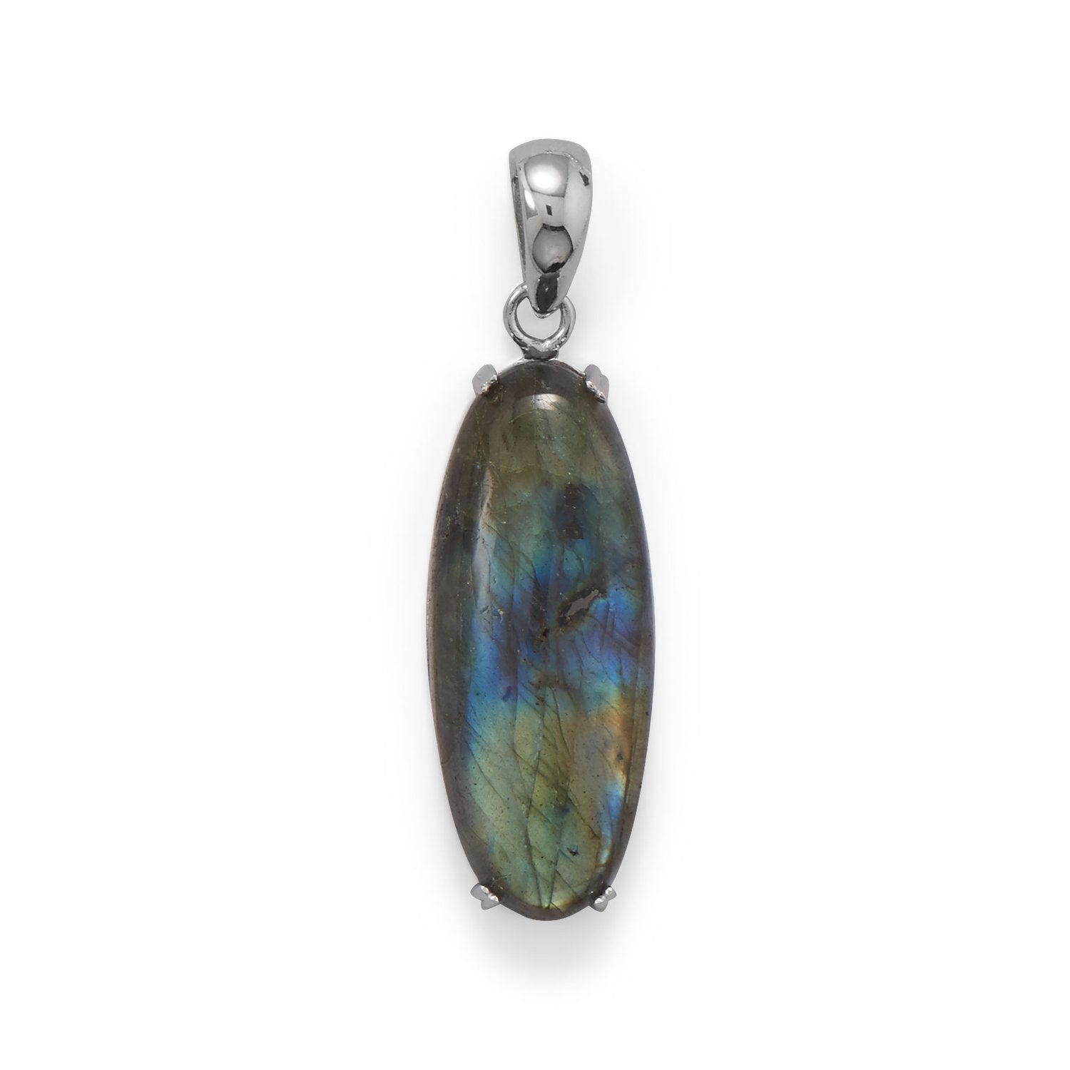 Sterling silver pendant features a gorgeous, large oval labradorite stone in the center. Stone measures approximately 30mm x 12mm. Total hanging length is 42.6mm. .925 Sterling silver