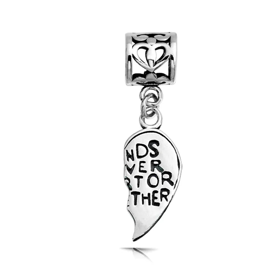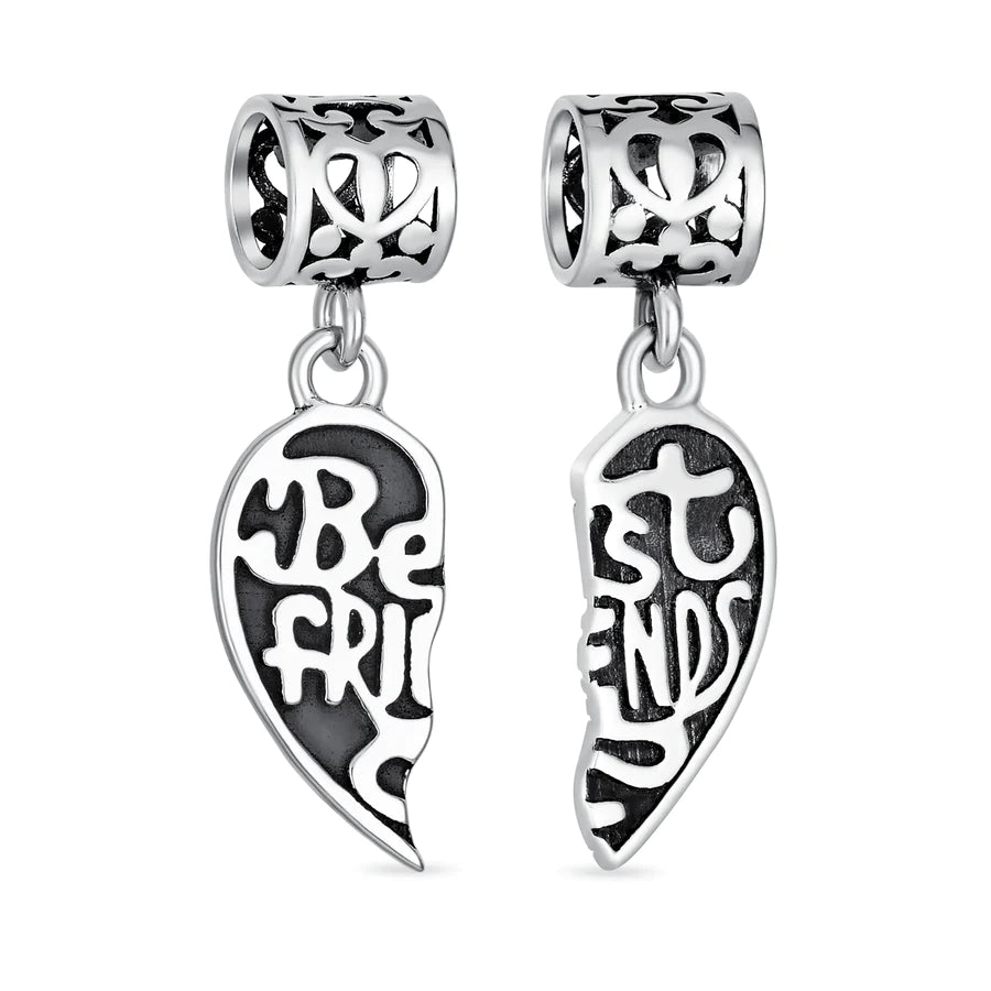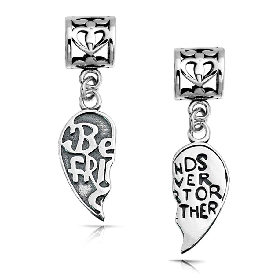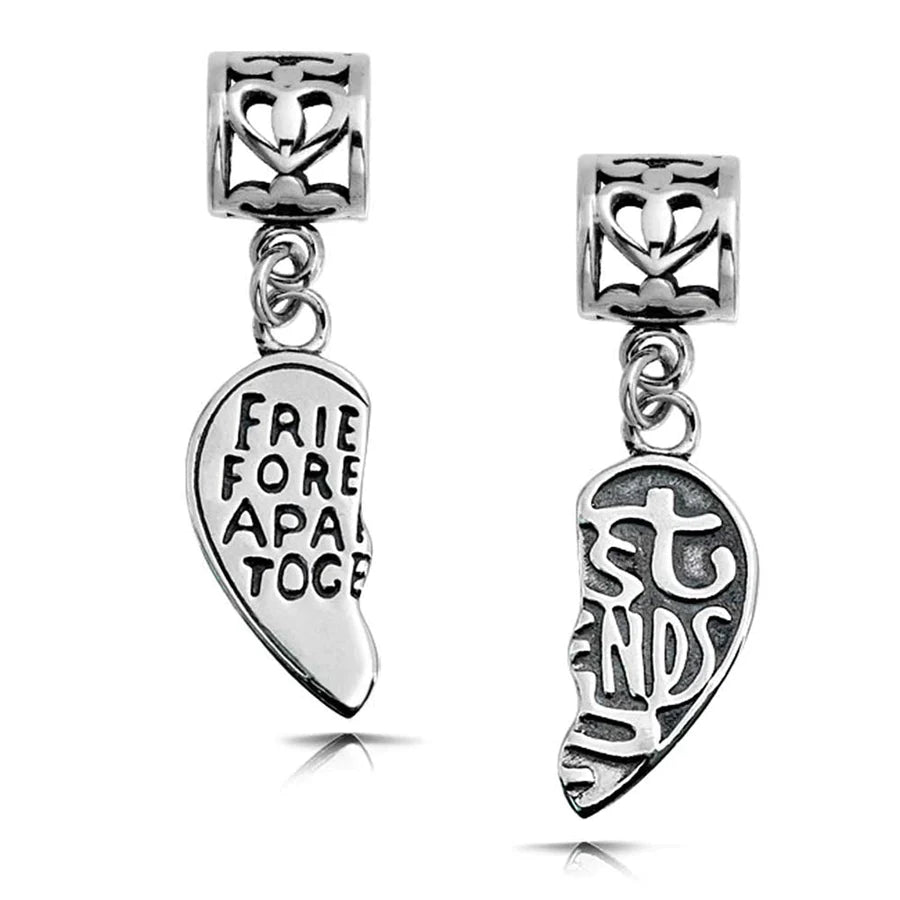 Give the gift of friendship that your best friend will cherish. Even if you and your BFF are not always together in the same city, it is easy to show her how you feel about her. Hanging from a sterling silver bail that boasts an open heart design, one side of the dangling silver heart charm reads best friends. The other side of the split heart reads friends forever apart or together. Because of this feature, the dangling heart charm can also be worn as a necklace. Share your special friendship proudly when you wear this piece of meaningful bead jewelry.