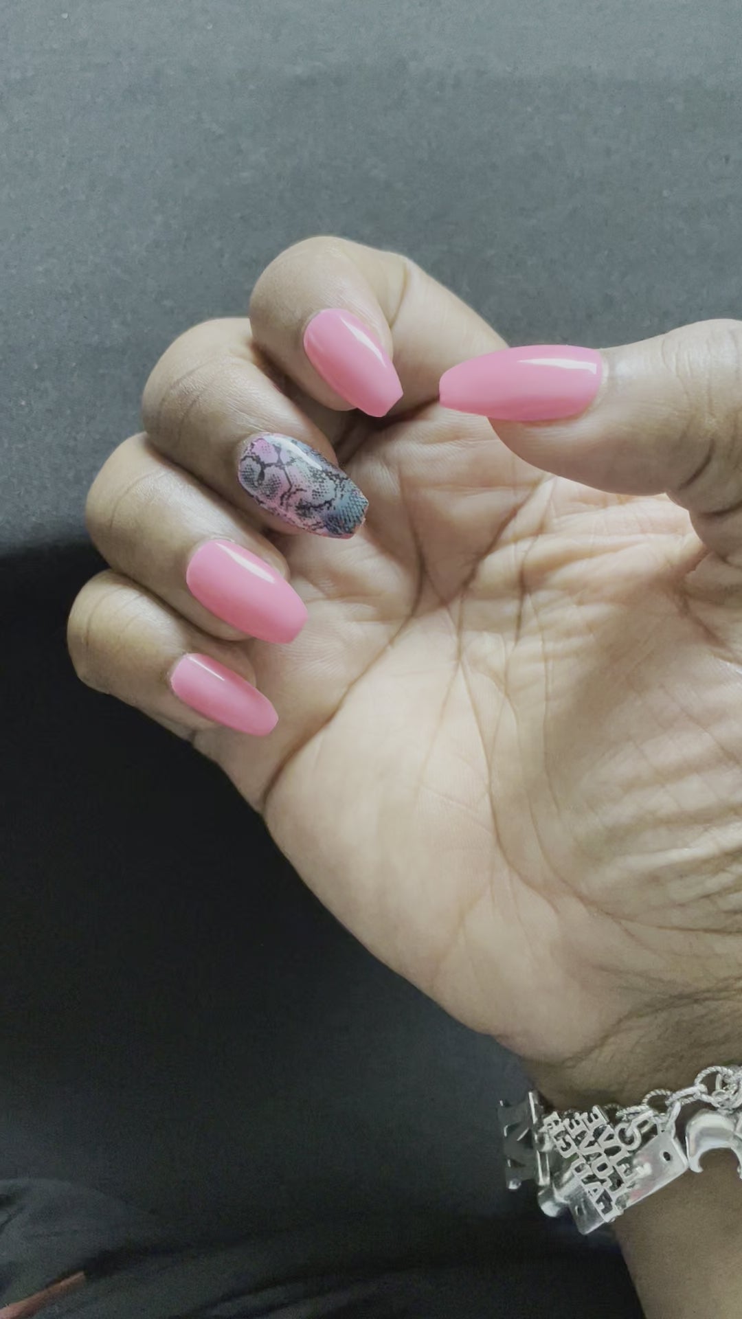 Our “Experiment 279” set features an electric pink nail in a sHirt Coffin shape.