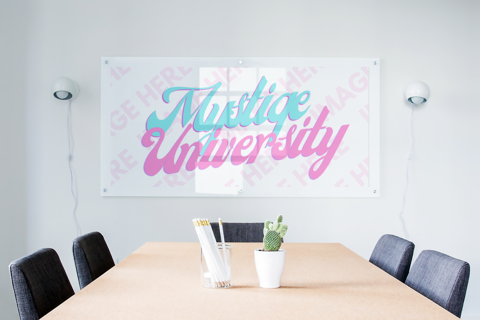 This mockup is a great way to showcase your new logo design or visualizing your logo in a realistic environment. This mockup features a bright office meeting room with your logo displayed on a large glass indoor signage plate.