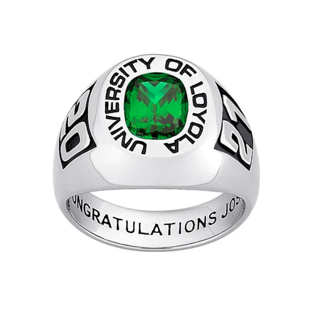 Expertly crafted in solid Sterling Silver, this distinguished Men's Embossed Year Class Ring showcases a cushion-cut birthstone or school color stone (10 x 8 mm) encircled by your engraved school name. The graduation year appears in polished raised characters on both side panels. Customize with school name (maximum 21 characters), 4-digit graduation year, and interior engraving (up to 18 characters). Available in sizes 5-14, including half sizes.