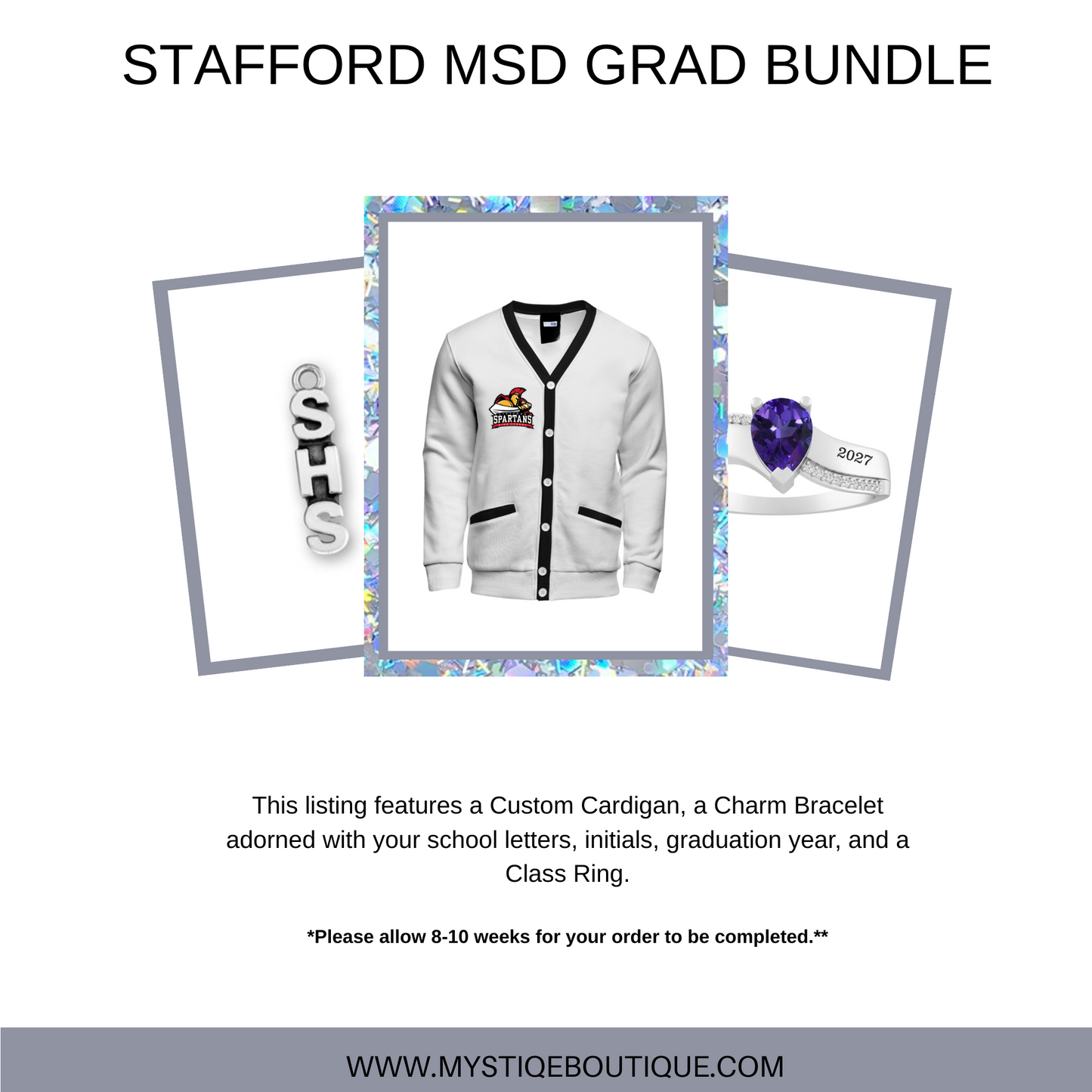 Mark your senior year with the Stafford Grad Bundle, thoughtfully crafted for young women. This set features a cardigan in your school's official colors, a classic Class Ring, and a Sterling Silver Charm Bracelet adorned with your School Emblem, combining tradition and sophistication into a meaningful keepsake. Each item is custom-made with an 8-10 week production period; expedited orders are not offered. Following your purchase, you will receive an email to share your personalization preferences for your unique bundle.