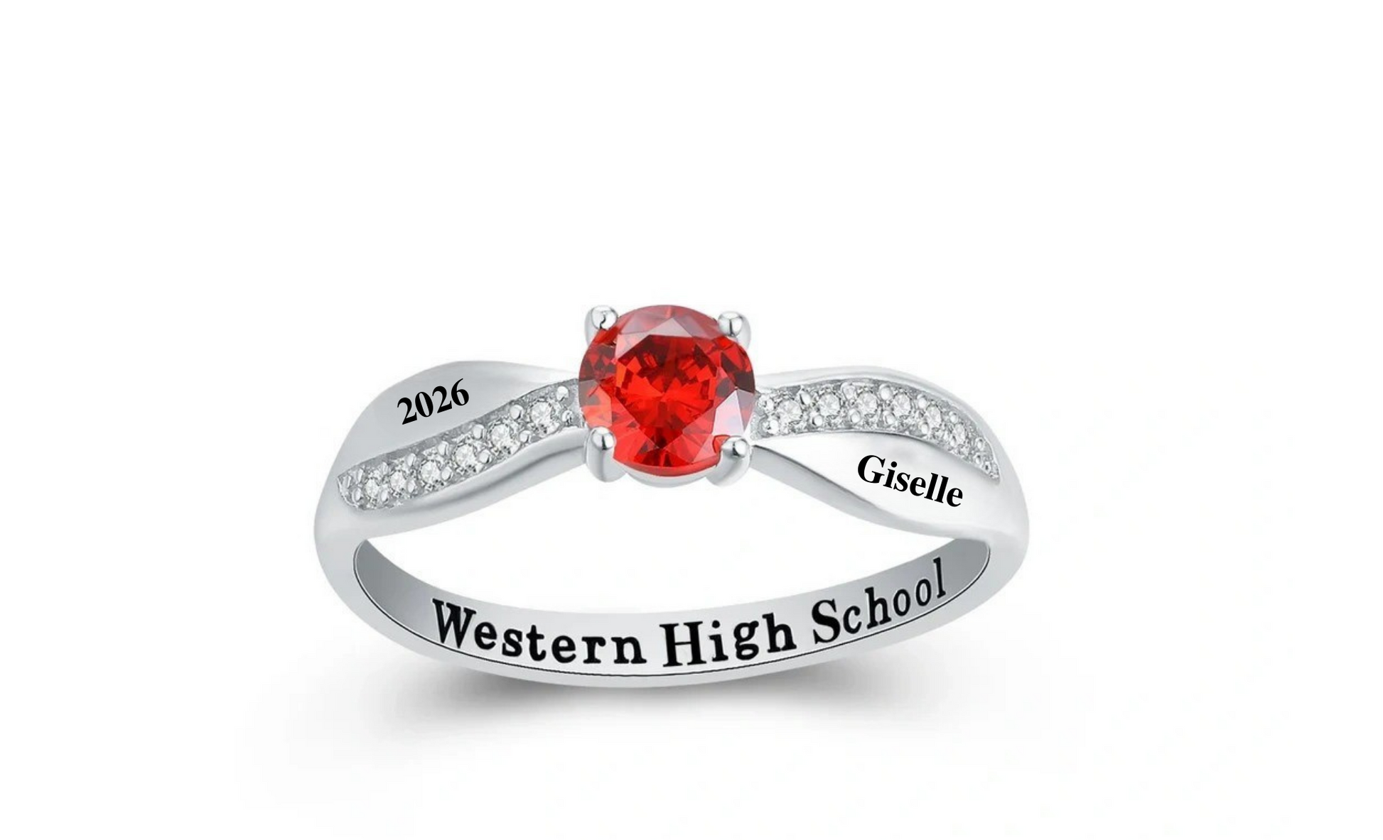 Does your heart belong to your high school? If so, this Freestyle exclusive from Mystiqe Boutique is the perfect class ring for you. Slim Sterling Silver band is personalized with your school name or text of your choice, Austrian crystal birthstone or school color, graduation year and your name. Choose a school name (up to 10 letters), birthstone, graduation year (4 digits), and your name (up to 10 letters).