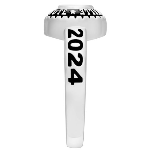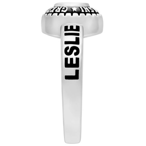 This chic class ring holds her birthstone at center with her high school name in polished letters and an finish. It's simple, elegant...and will never, ever go out of style! The fully personalized setting is beautifully crafted in Sterling Silver.